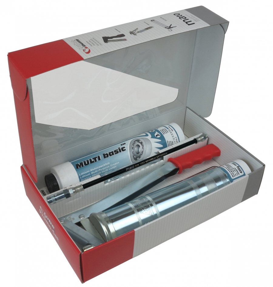 Lube-Shuttle Promo-Set in display carton includes Lube-Shuttle side-lever grease-gun with two Lube-Shuttle cartridges MULTI Basic 2M with PH-30, M10x1